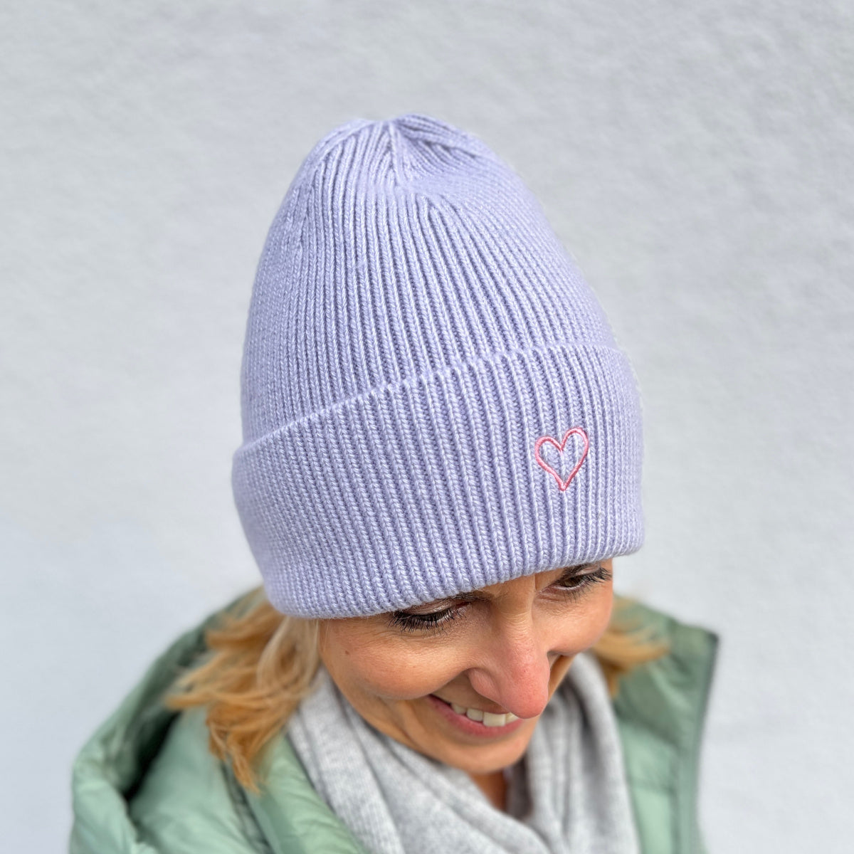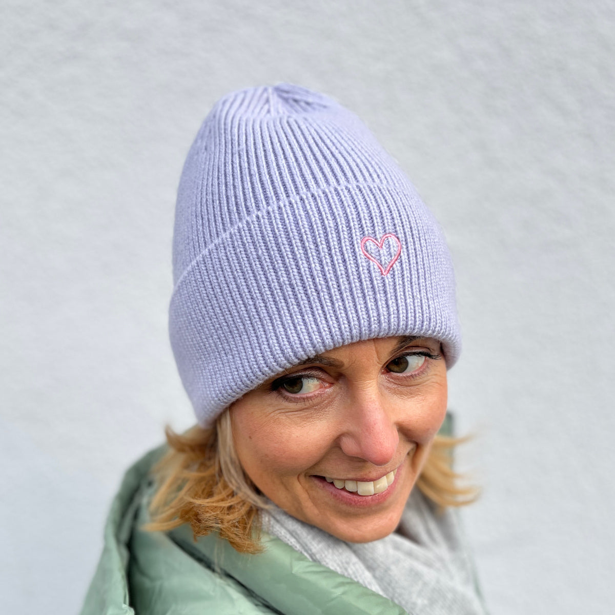 Herzlein® Kaschmir Mütze mit Umschlag "Herzchen" in Lavendel
