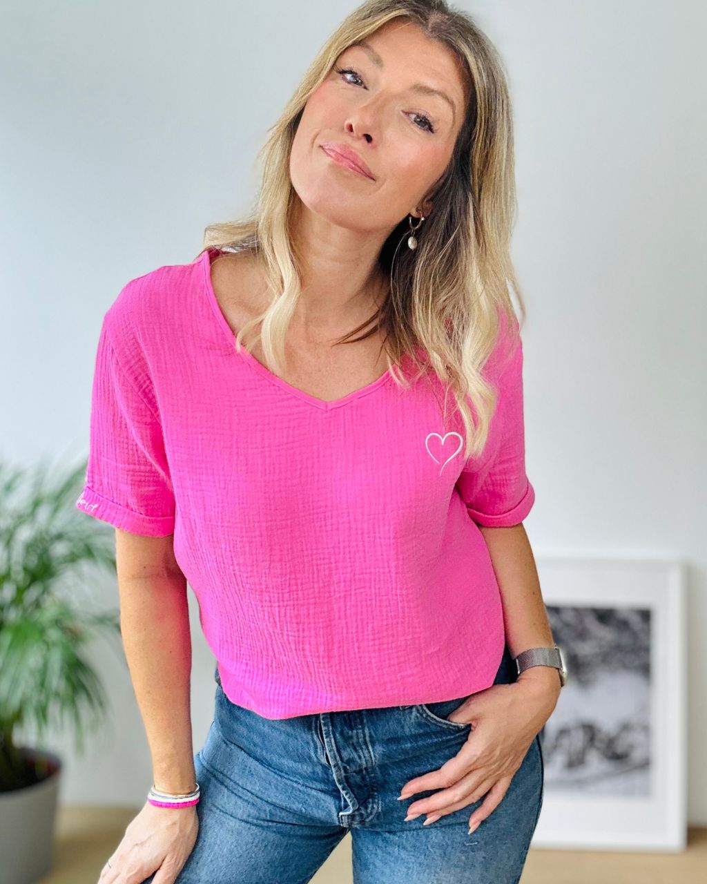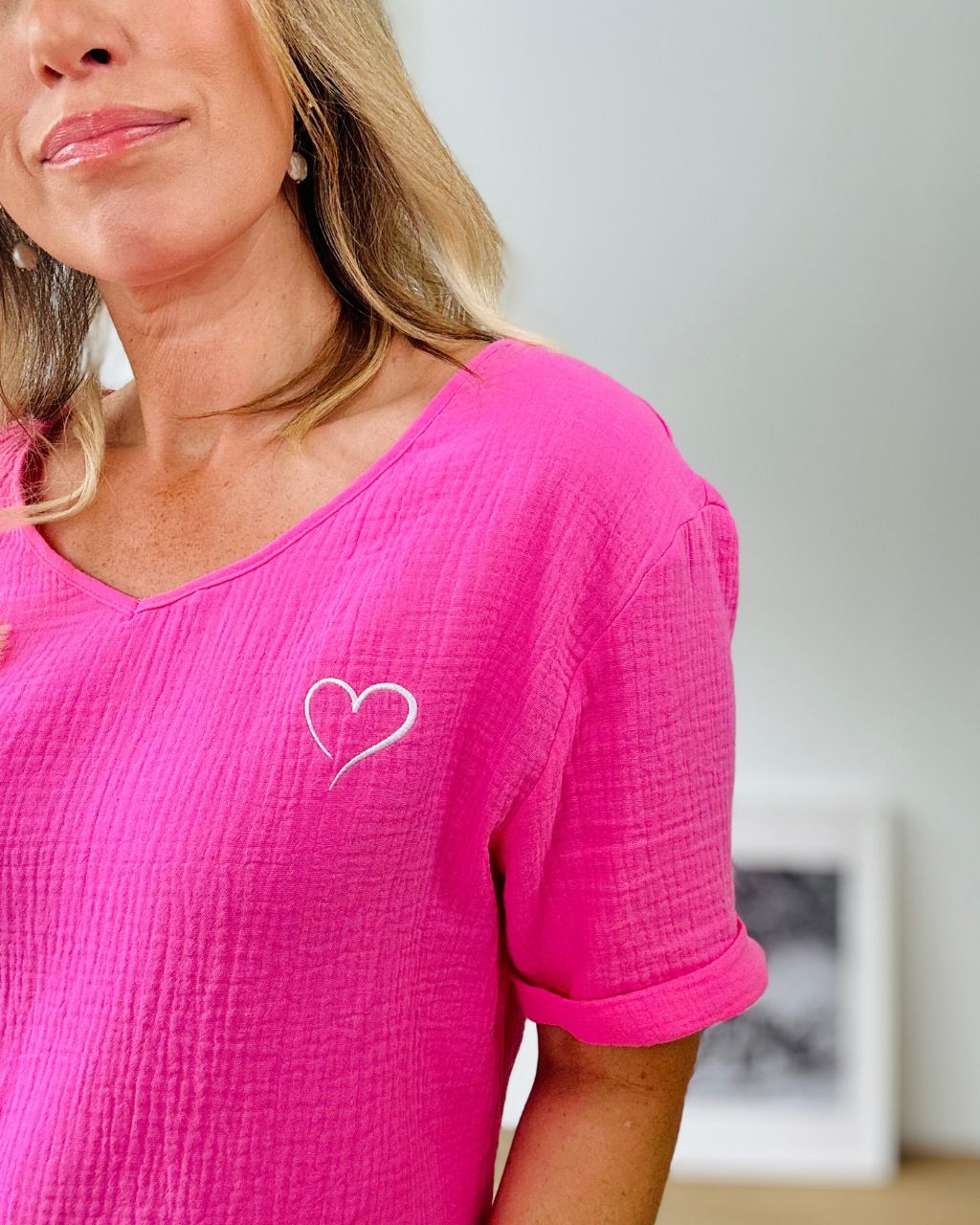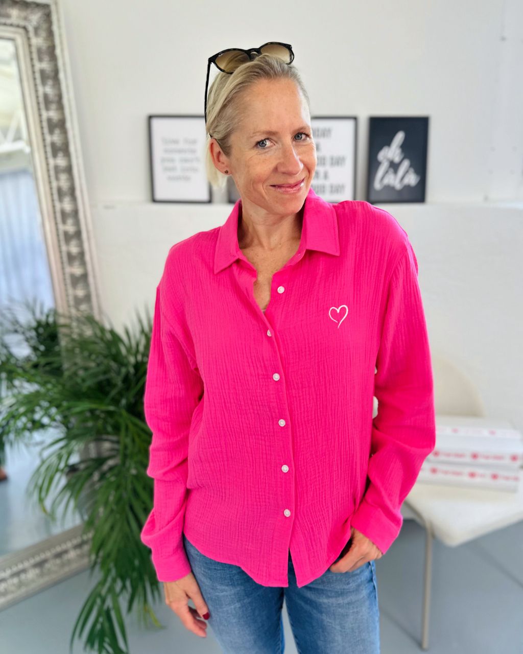 Regulärer Preis €45,00 Verkaufspreis €45,00Herzlein® Musselin Shirt mit "Herzchen-Stick" in Pink