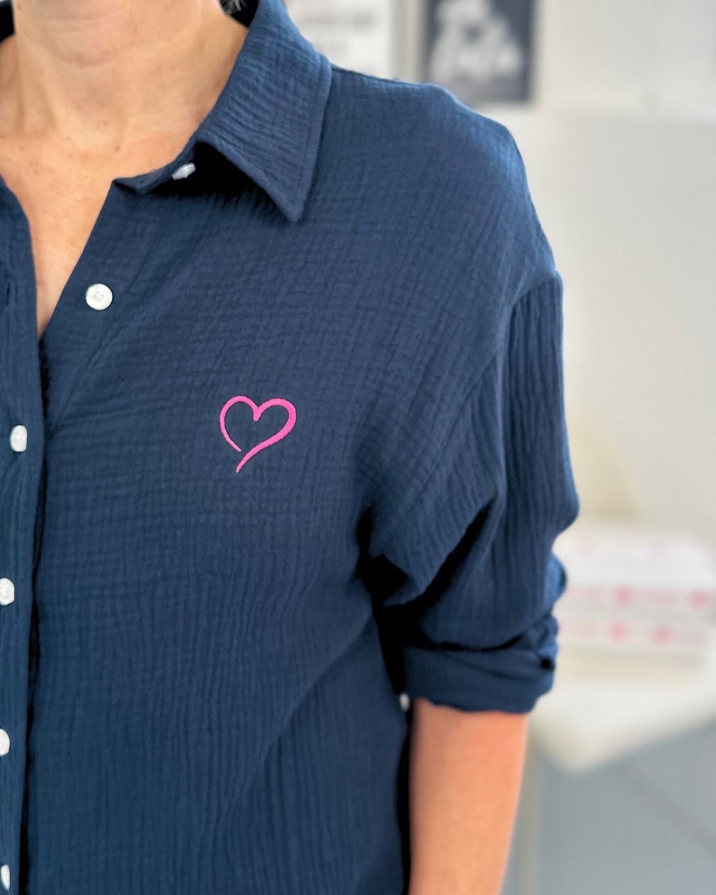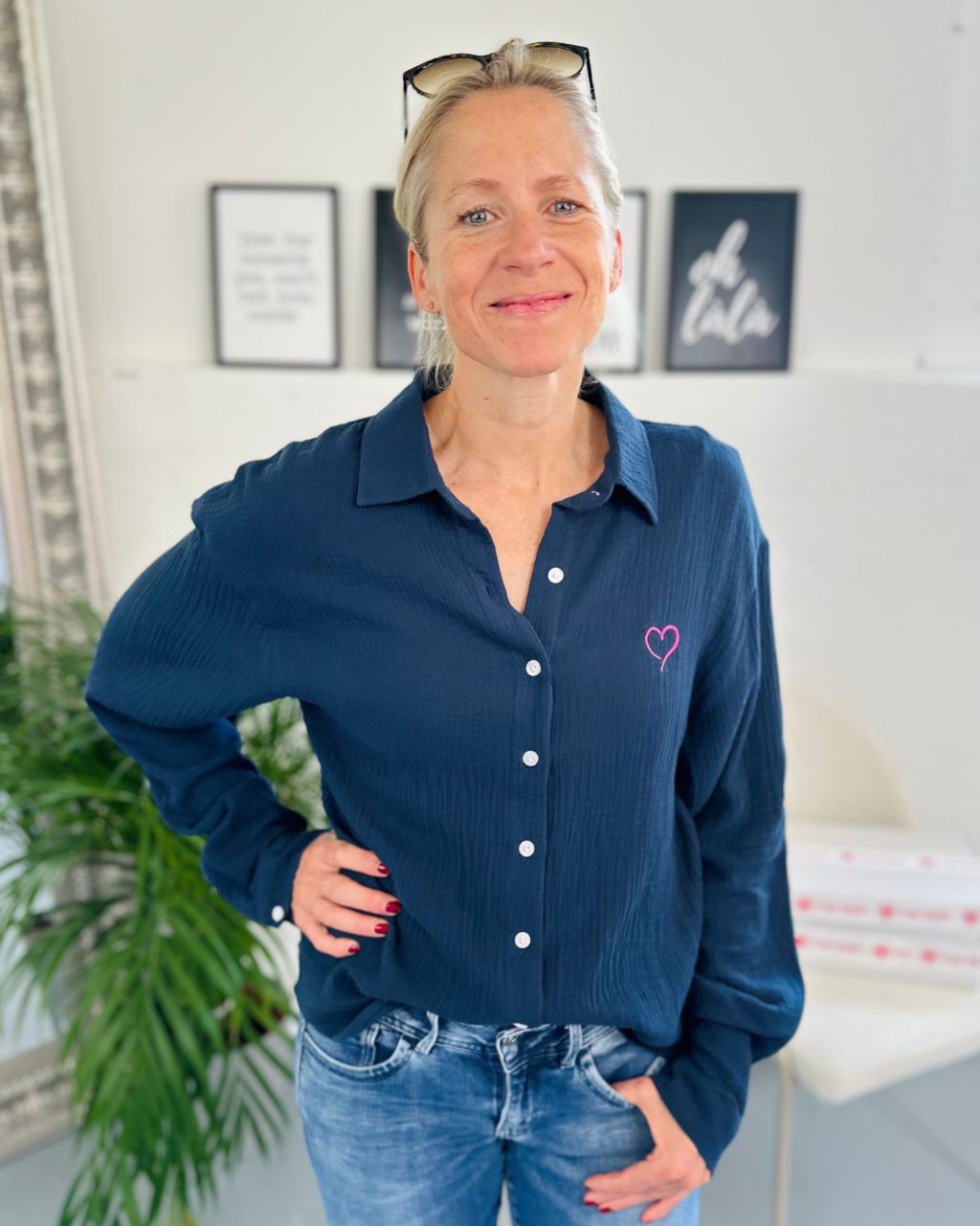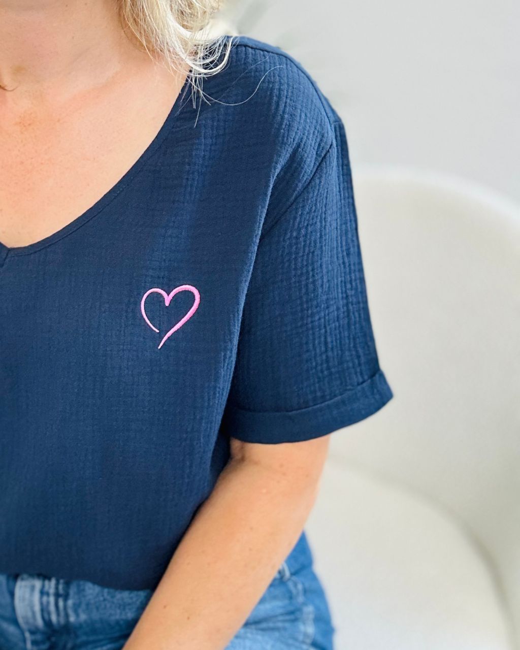 Regulärer Preis €45,00 Verkaufspreis €45,00Herzlein® Musselin Shirt mit "Herzchen-Stick" in Navy Blau
