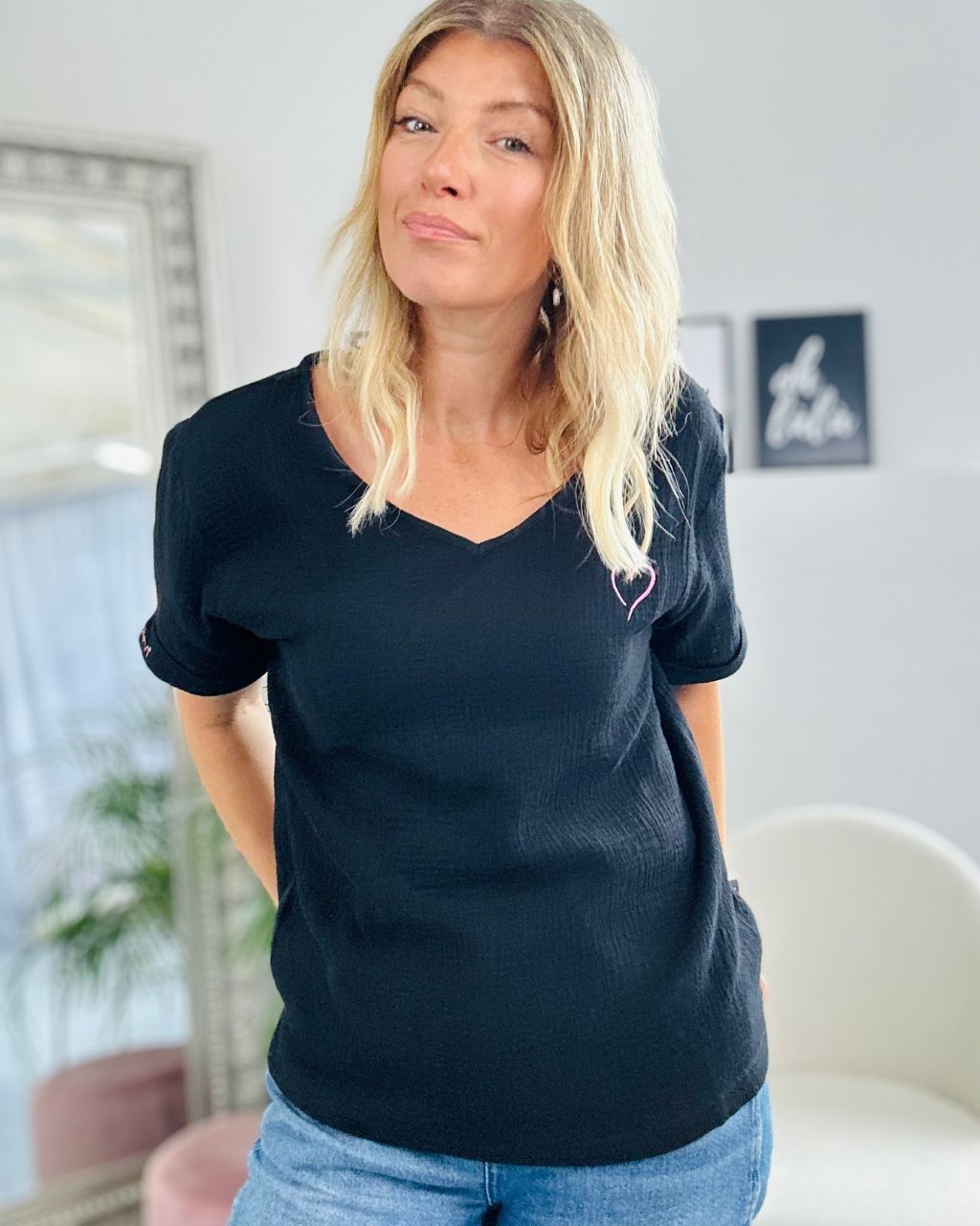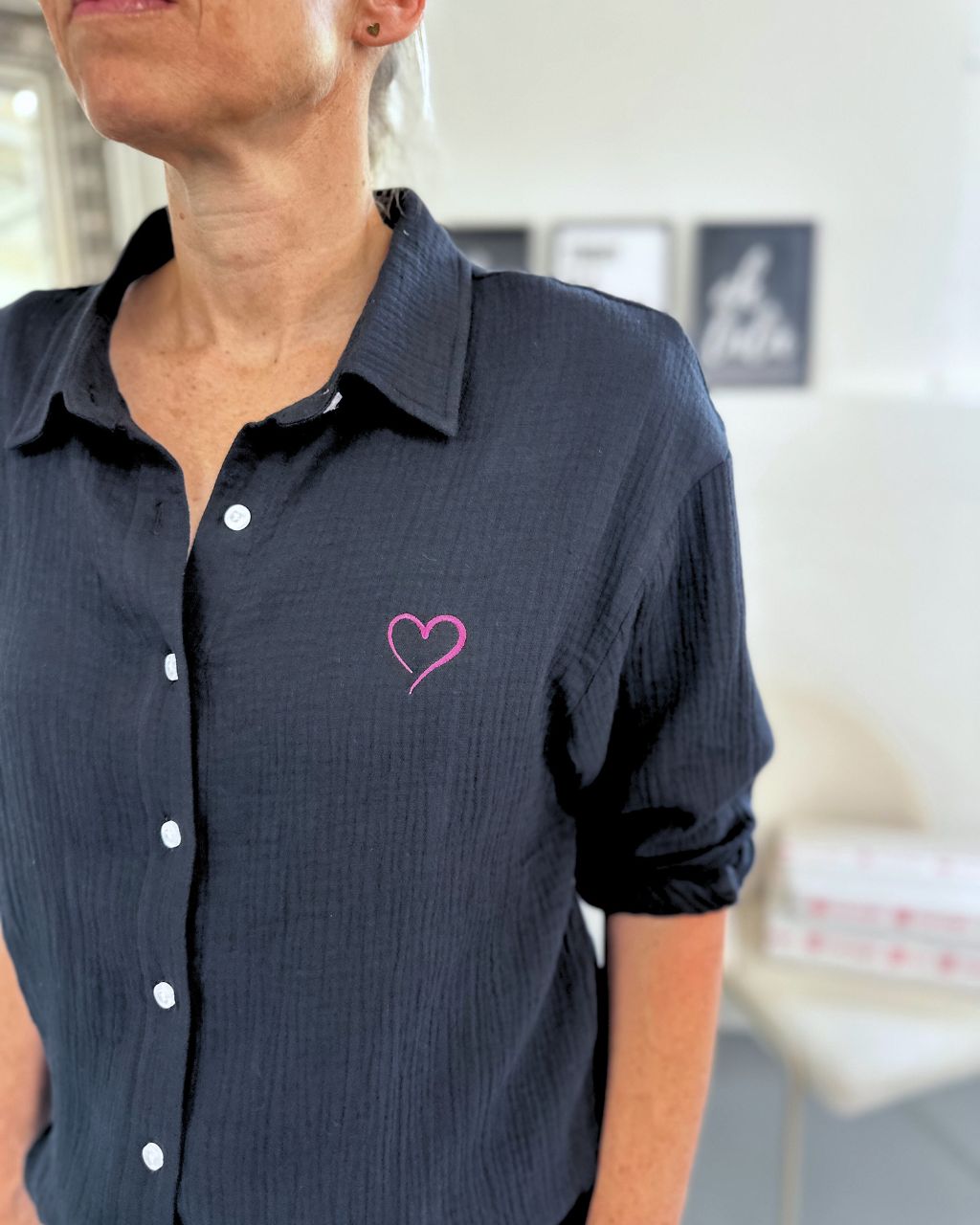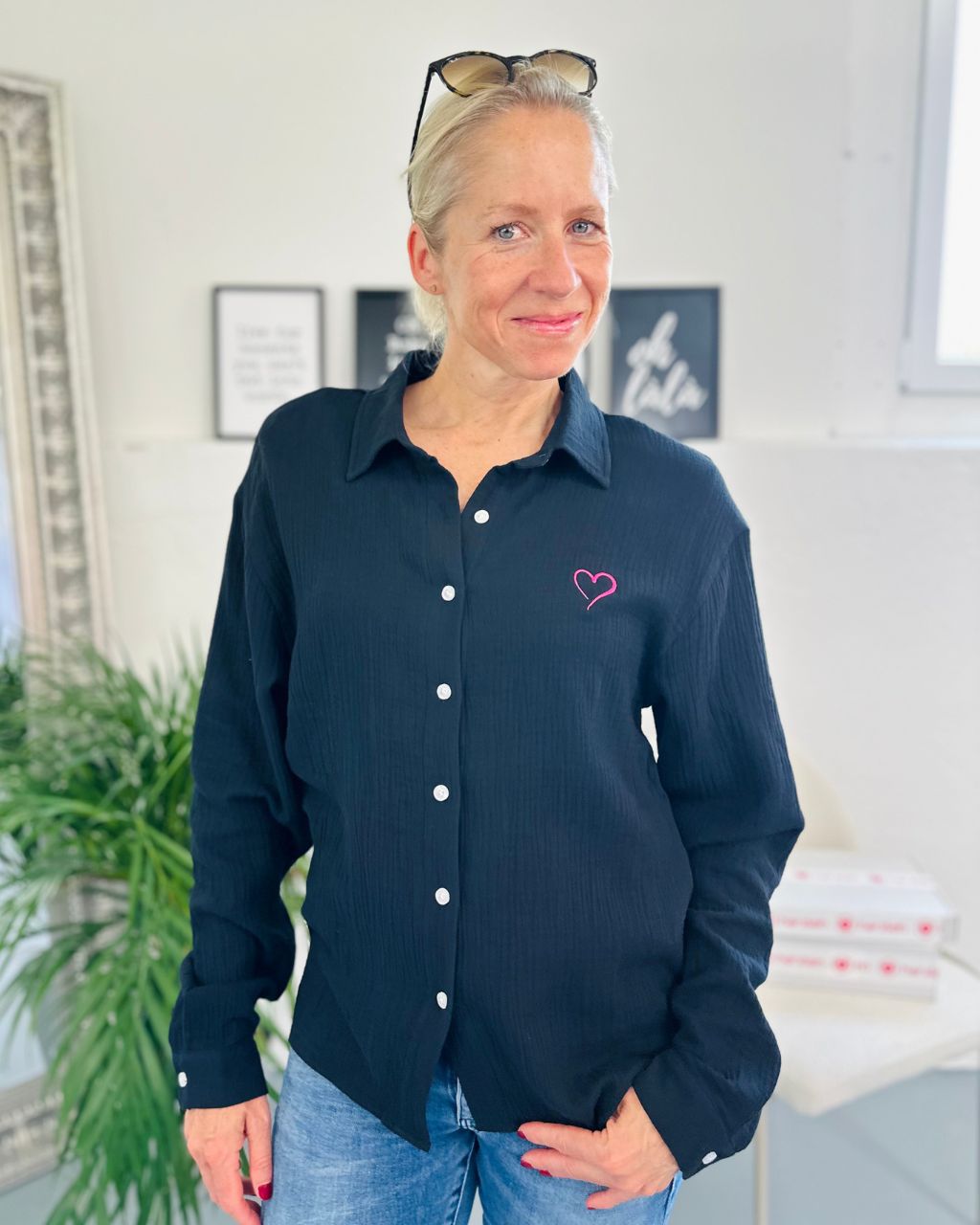 Regulärer Preis €34,95 Verkaufspreis €34,95Herzlein® Musselin Shirt mit "Herzchen-Stick" in Schwarz