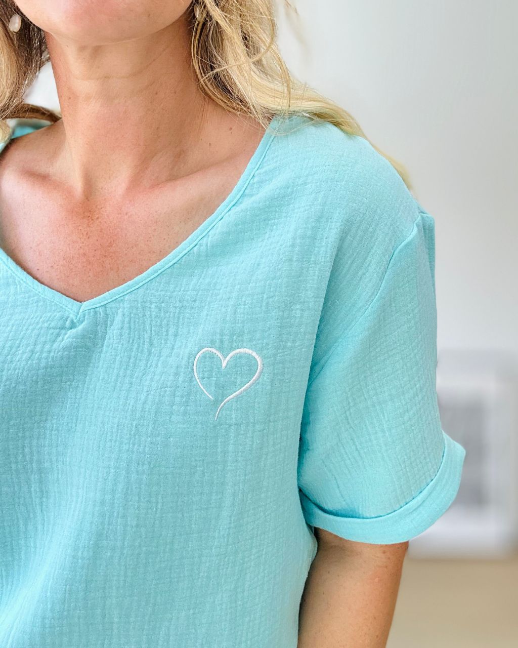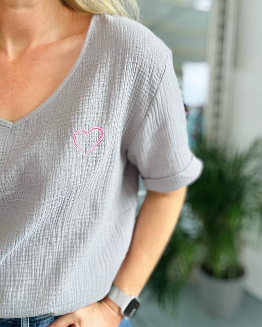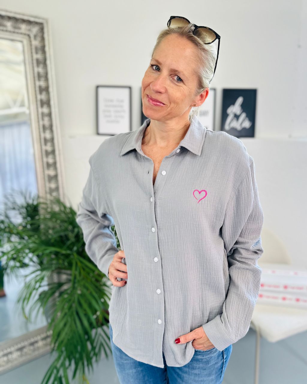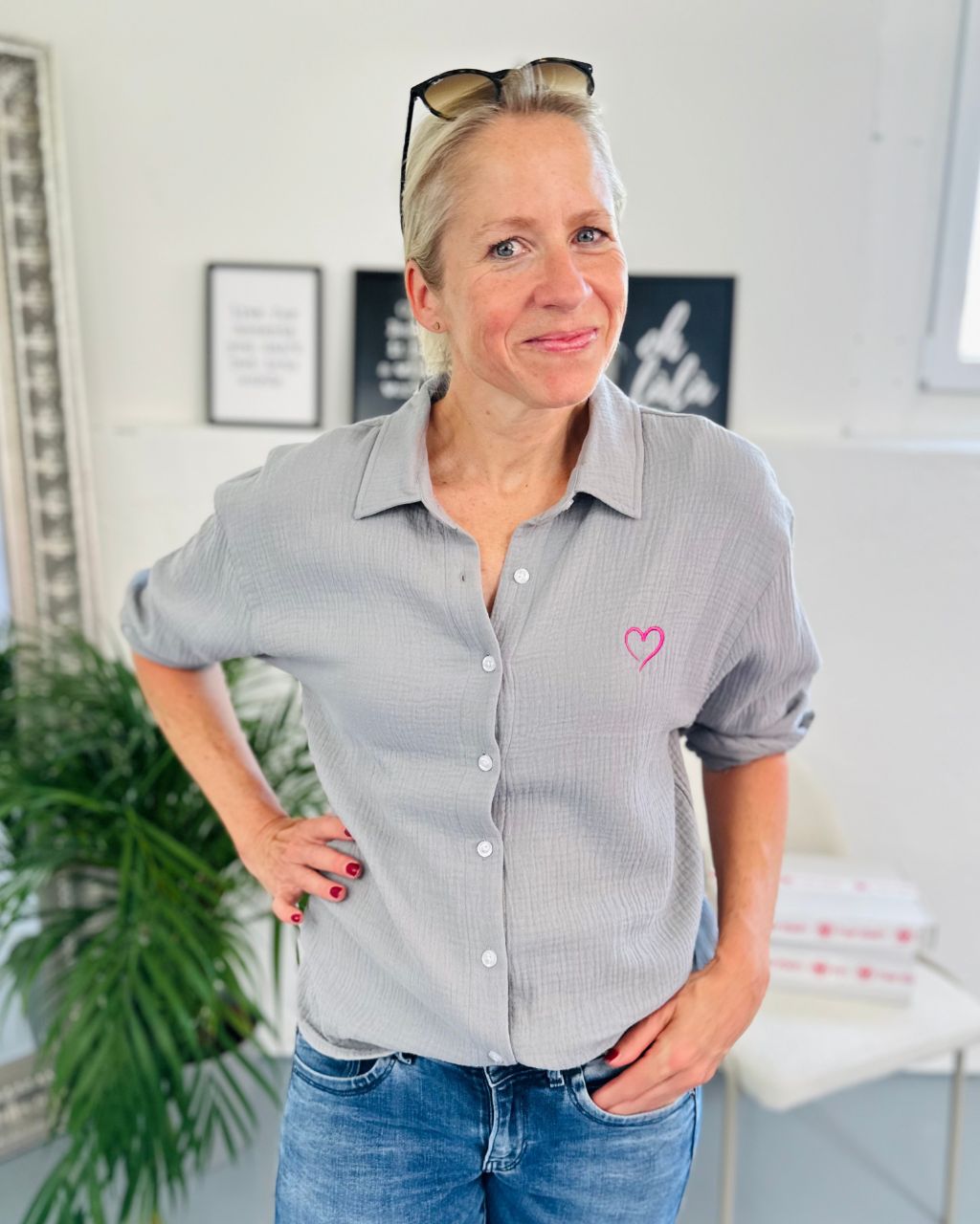 Regulärer Preis €34,95 Verkaufspreis €34,95Herzlein® Musselin Shirt mit "Herzchen-Stick" in Grau