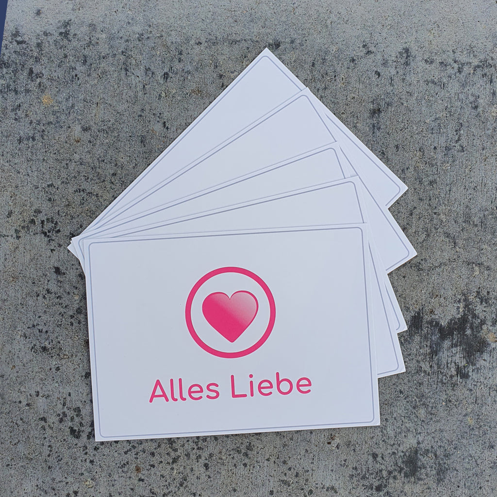 5 Herzlein® Grußkarten mit dem Text "Alles Liebe" und dem schönen Herzchen-Logo. Aus festem und stabilem 350 g/m2 Postkartenkarton. Die Karte ist 14,8 x 10,5 cm groß (Din A6).