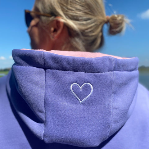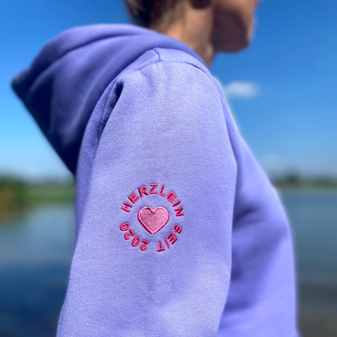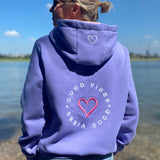 Dieser Hoodie in der Farbe Lavendel ist besonders schön verarbeitet. Auf der Vorderseite gibt es den edlen 3D-Stick "HAPPY" mit Herzchen. Auf der Rückseite eine wunderschöne 3D-Stickerei mit "Good Vibes".
