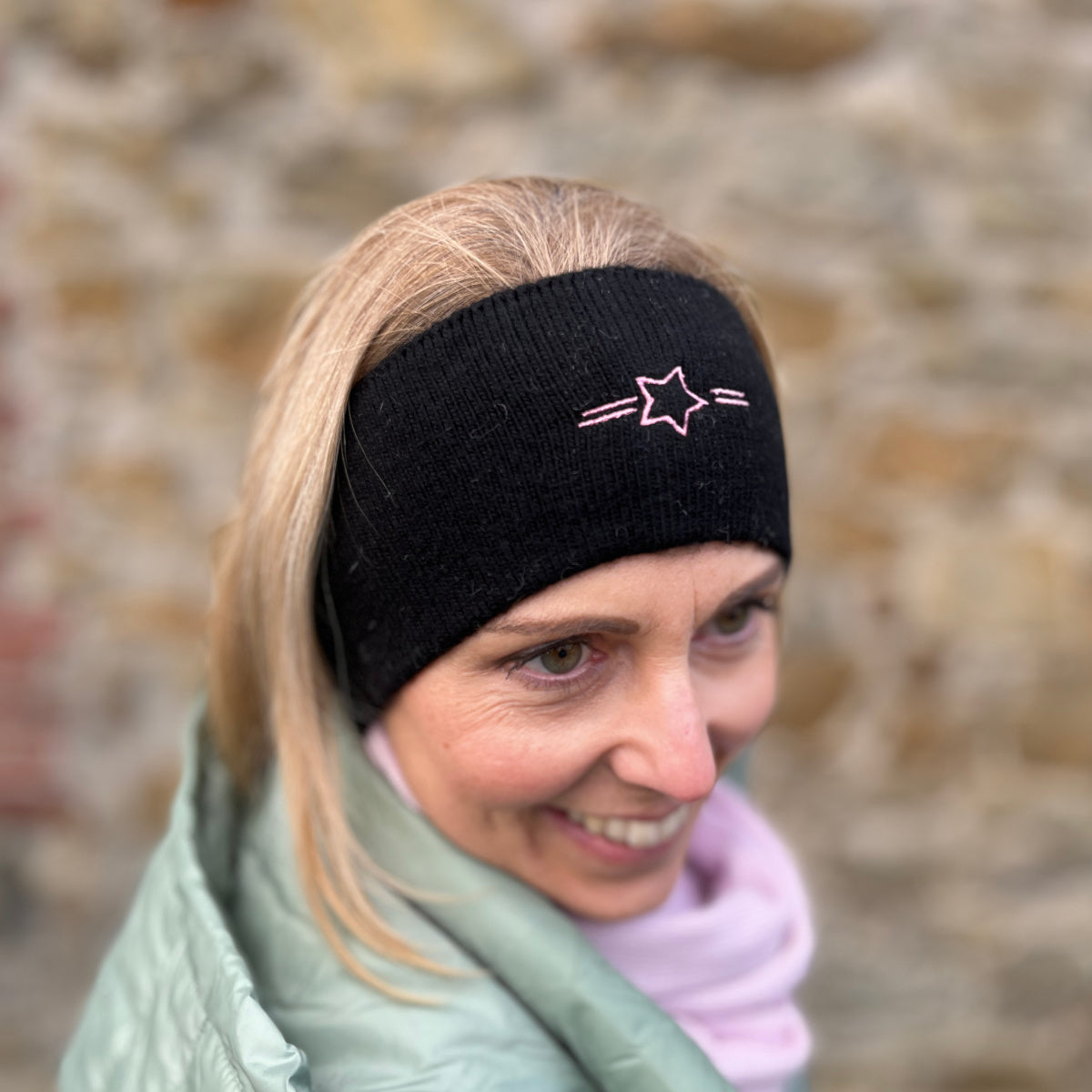 Ein besonders weiches und hochwertiges Stirnband mit Kaschmir in der Farbe Schwarz mit schönem Stern Stick