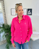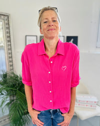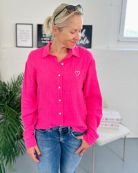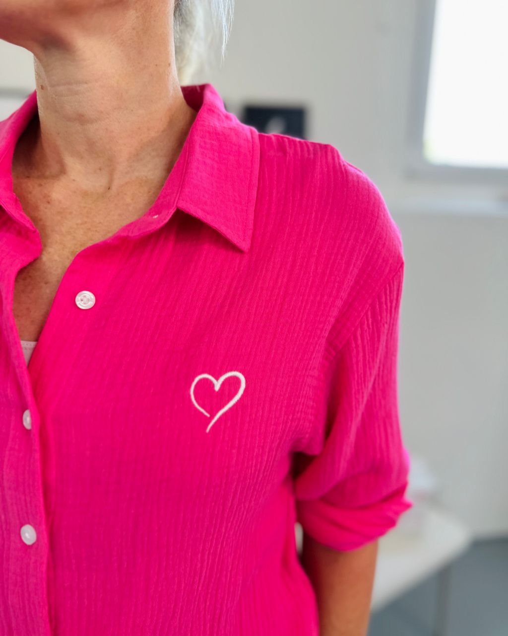 Sehr weiche und bequeme Bluse aus Musselin Stoff in der Farbe Pink mit einem edlen, gestickten Herzchen in Weiß.