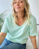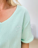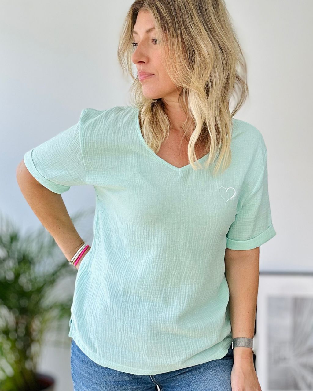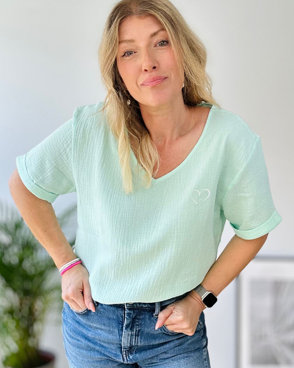 Sehr weiches und bequemes T-Shirt in der Farbe Mint mit einem schönen Stick auf der Brust und einem edlen Stick auf dem Ärmel.