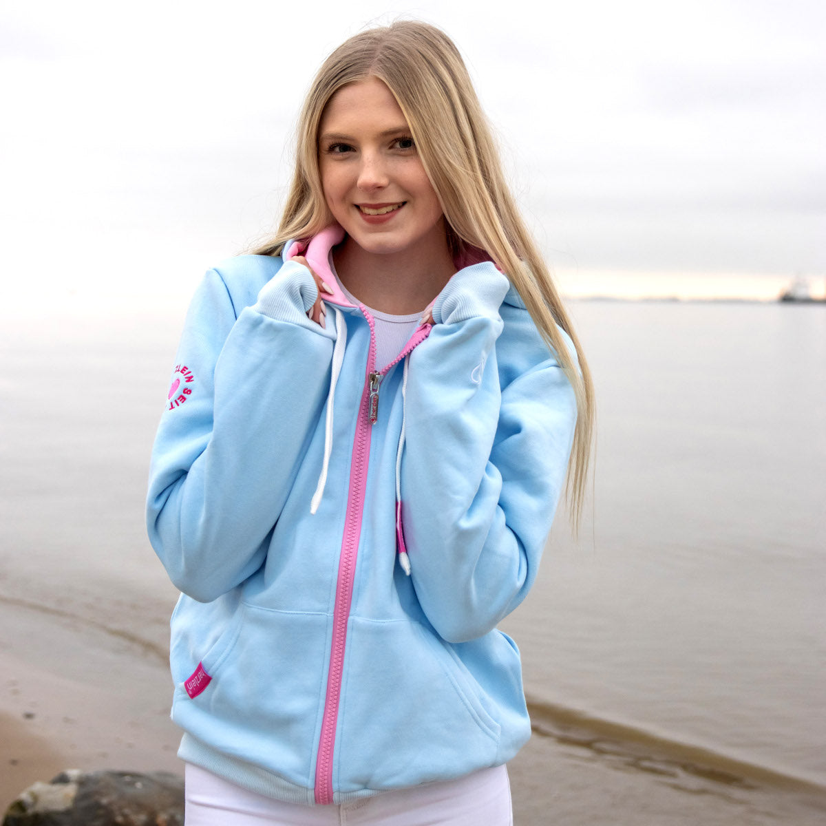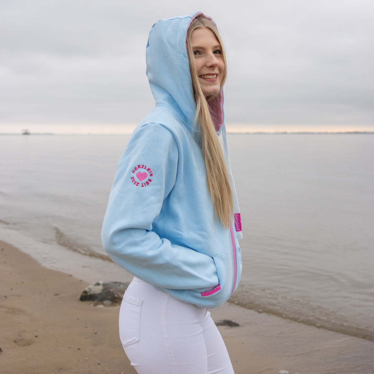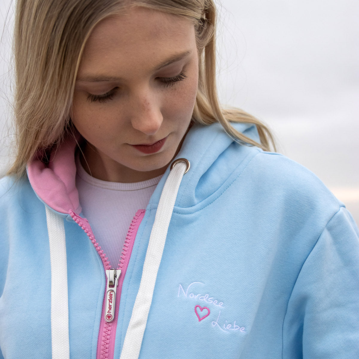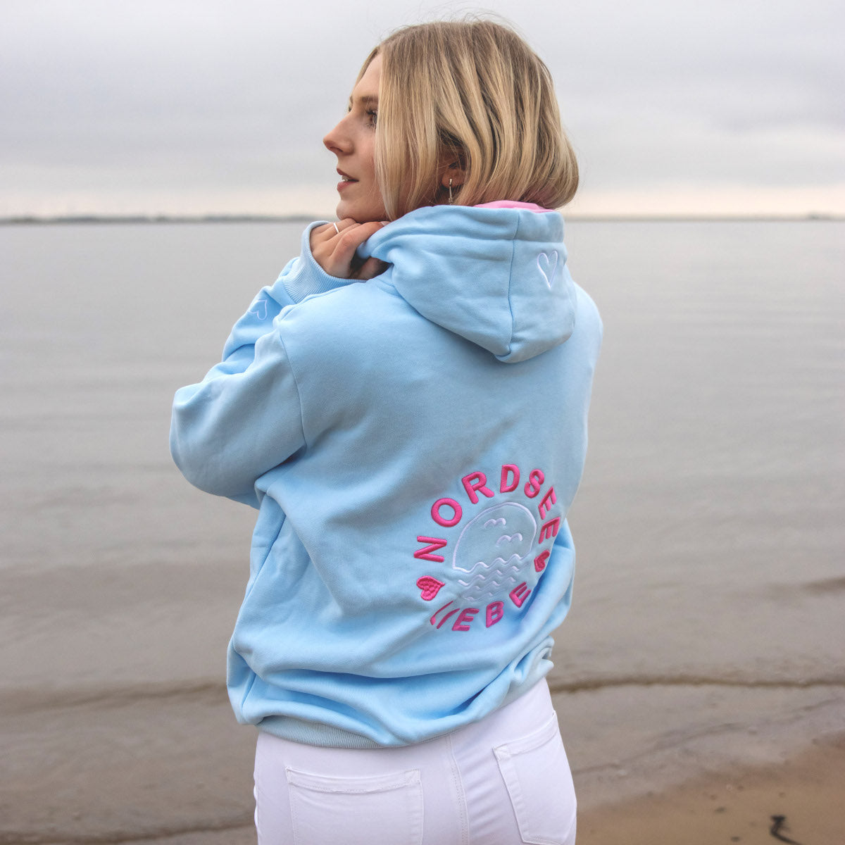 Diese Sweatjacke mit Kapuze in der Farbe Pastell Blau ist besonders schön verarbeitet. Sowohl auf der Vorderseite wie auf der Rückseite gibt es wunderschöne Stickereien mit "Nordsee Liebe".