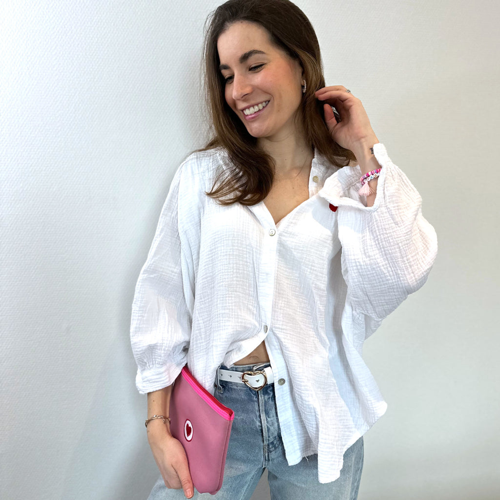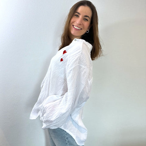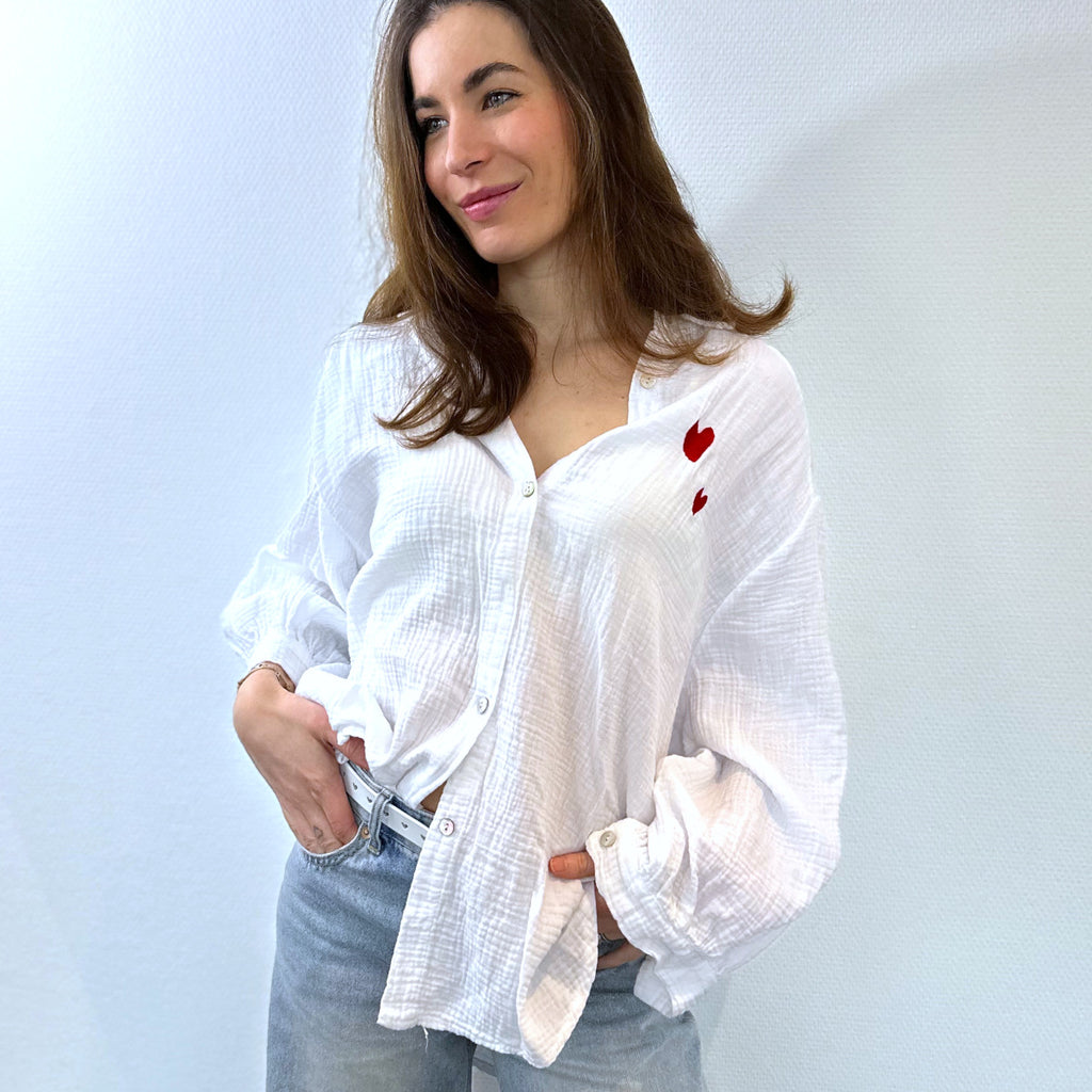 Weiche und bequeme Blouse aus Musselin Stoff in der Farbe Weiß mit 2 roten Herzchen